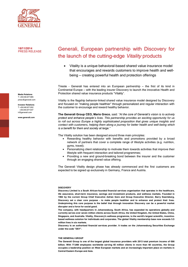 18 November - The Generali Group (“Generali”) today announced a strategic partnership that will see the introduction of Discovery’s shared-value insurance model to the European market. Generali is one of the 50 largest organisations in the world and serves over 60 million clients.